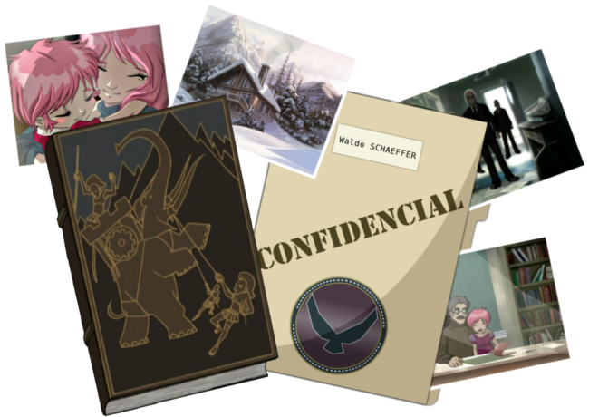 Proposition d'image à la backstory de la partie Histoire de Code Lyoko, regroupant les éléments principaux : Waldo et son fameux dossier vu dans le générique, Anthéa, Carthage, les Hommes en Noir, le Chalet.