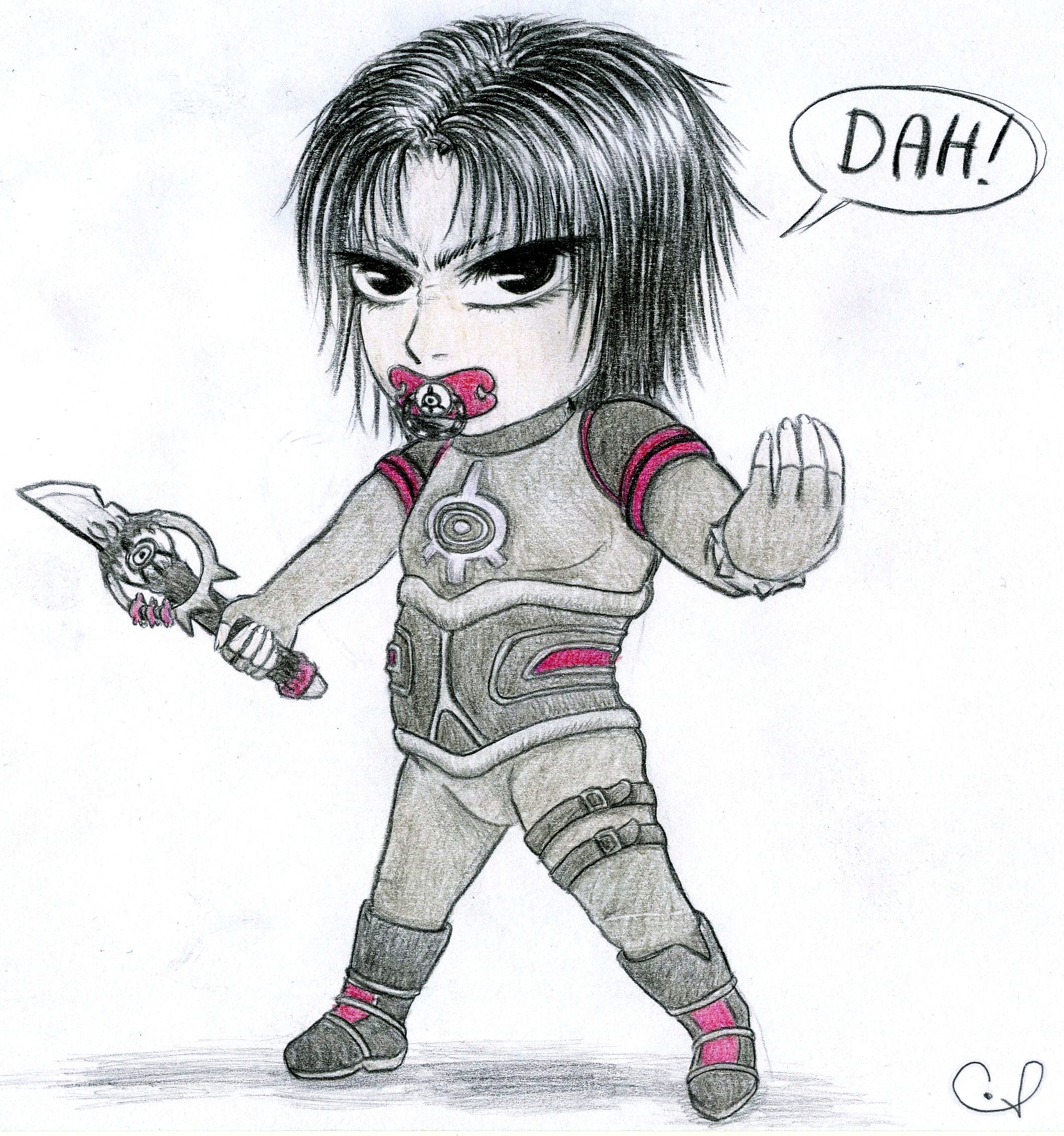 Et je reviens avec un petit bout xanatifié qui ne demande qu'à foncer dans le tas... Une heure et demie de travail, crayonné critérium et couleur au crayon. Je ferai une petite série de miniguerriers, je suis à l'écoute de toutes les demandes de poses ! (parce que c'est le plus dur à trouver, outre la tenue...Raccourcie^^)