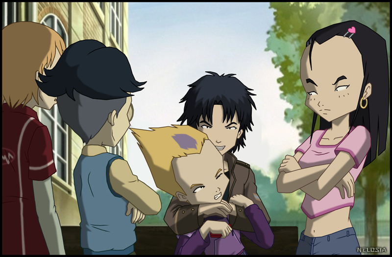 Illustration de ma nouvelle "Vivre sans Lyoko". Isolé sur un banc, Odd se fait attaquer par la bande de Sissi qui a recruté un nouveau membre...